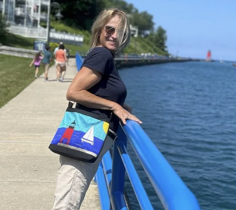 These bags are handmade on treadle sewing machines in a rural village in Cambodia by women entrepreneurs in their very own village workshop. It took six months of diagrams going back and forth between the Michigan designer and Cambodia to get the Silk Art designs to represent the lighthouses exactly!